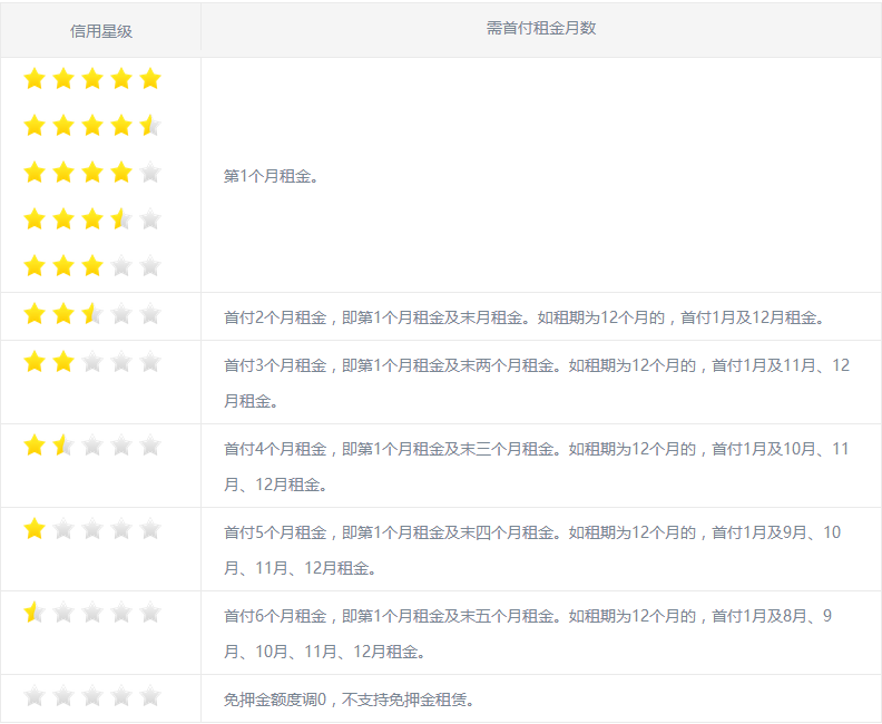 2.信用星級越低,將影響免押金額度的提升,甚至導(dǎo)致免押金額度的降低。三星級以下客戶再次下單時需首付多月租金。